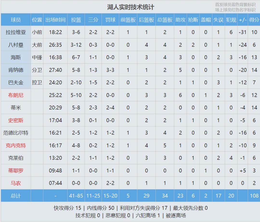 湖人首发:科比-巴夫金、肯纳德、拉拉维亚、八村塁、海斯。马刺首发:福克斯、卡斯尔、尚帕尼、瓦塞尔、文班亚马。湖人把最后一份正式合同给了科比-巴夫金,本赛季他主要在发展联盟征战,场均得到24.7分4.4板3.6助2.6失误。