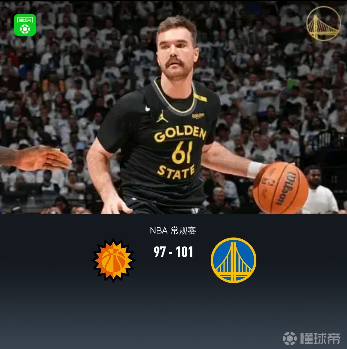 勇士101-97末节逆转太阳,斯宾塞20+6,桑托斯18分,狄龙24+6